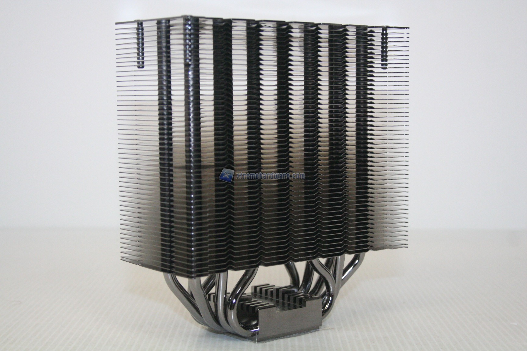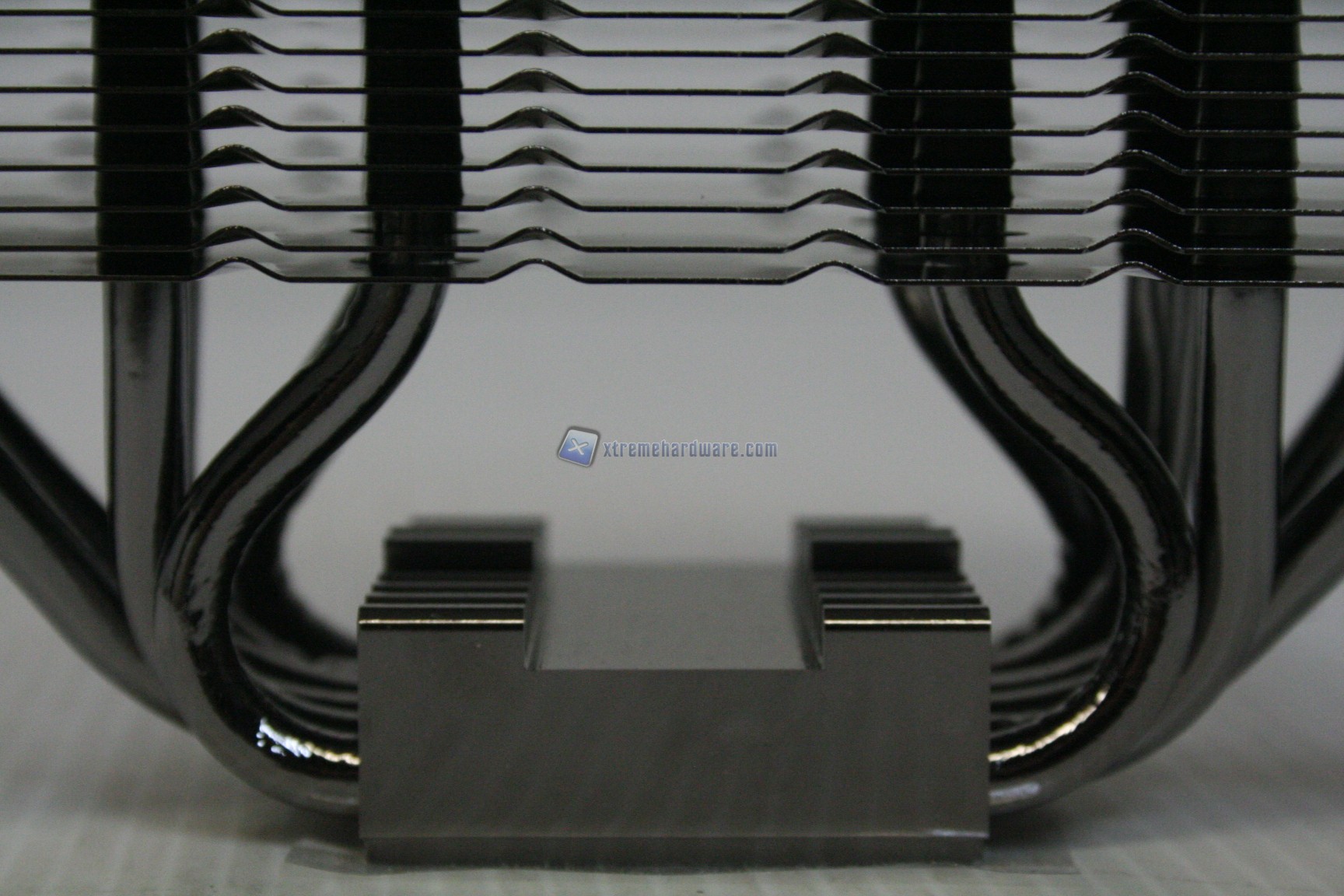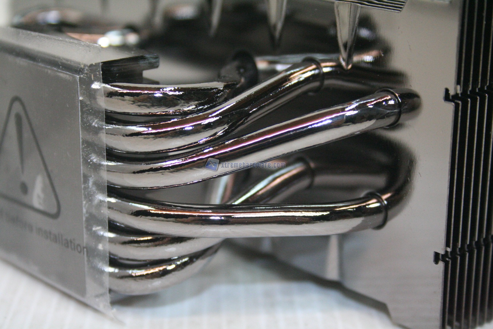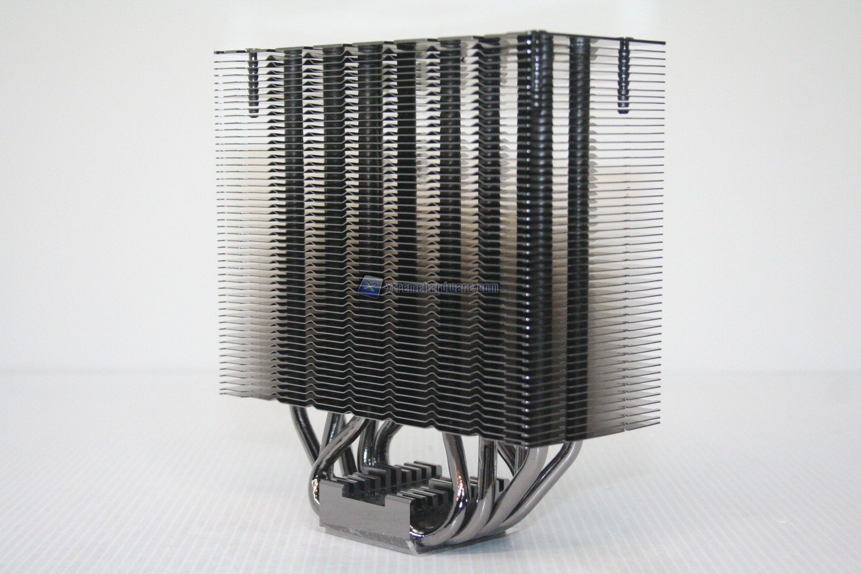 Oltre a questo, la lavorazione è di qualità elevatissima, ed il corpo dissipante presenta 6 heatpipes ad “U” distribuite quindi in modo eccellente sull’intero volume. Da notare le 6 rientranze frontali e posteriori, che spezzano i flussi d'aria in immissione, il particolare rialzo in prossimità di questi elementi e la finitura complessiva delle alette. Insomma, tutti elementi che denotano eccellenza costruttiva. La finitura in nichel integrale, è quindi assolutamente perfetta.