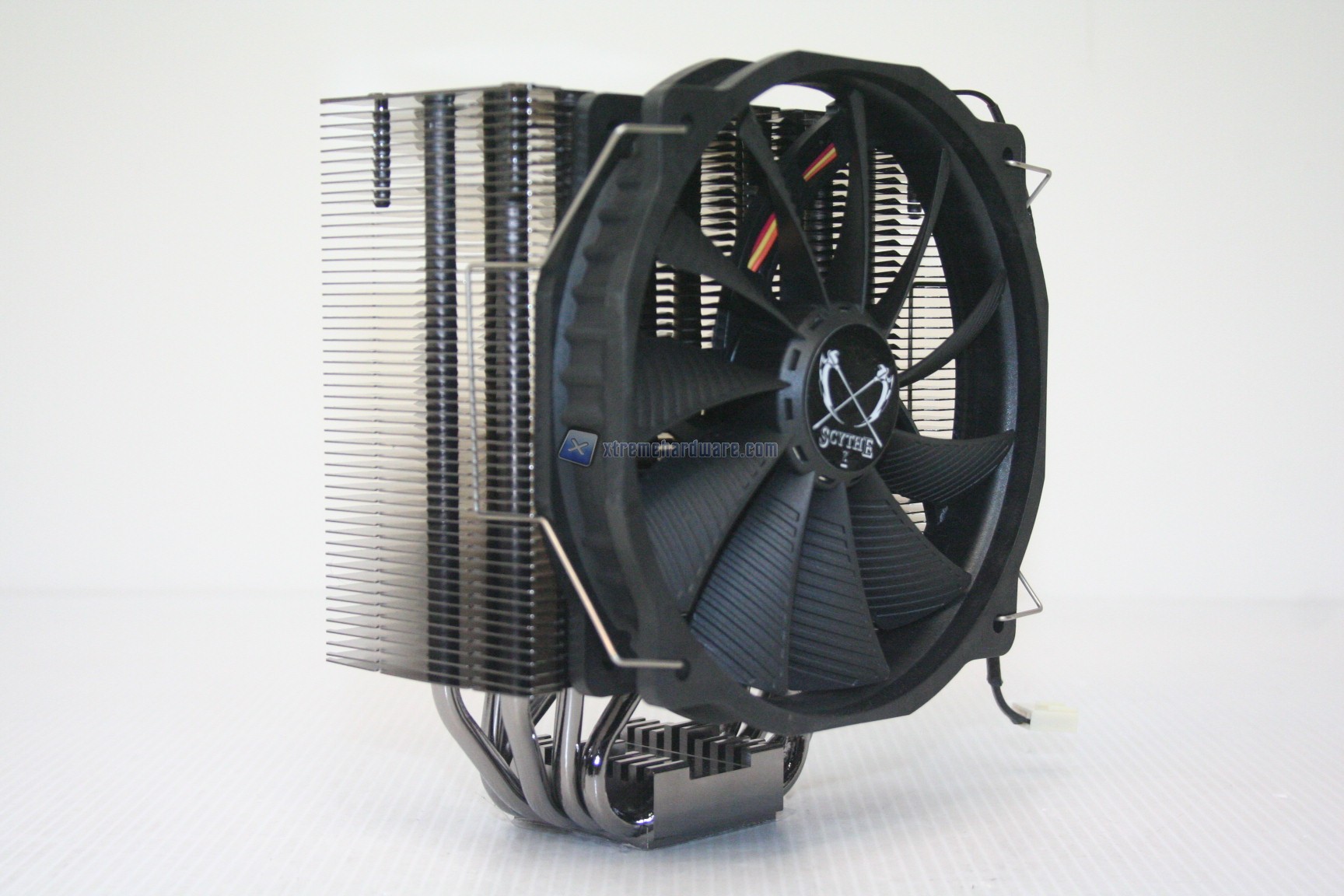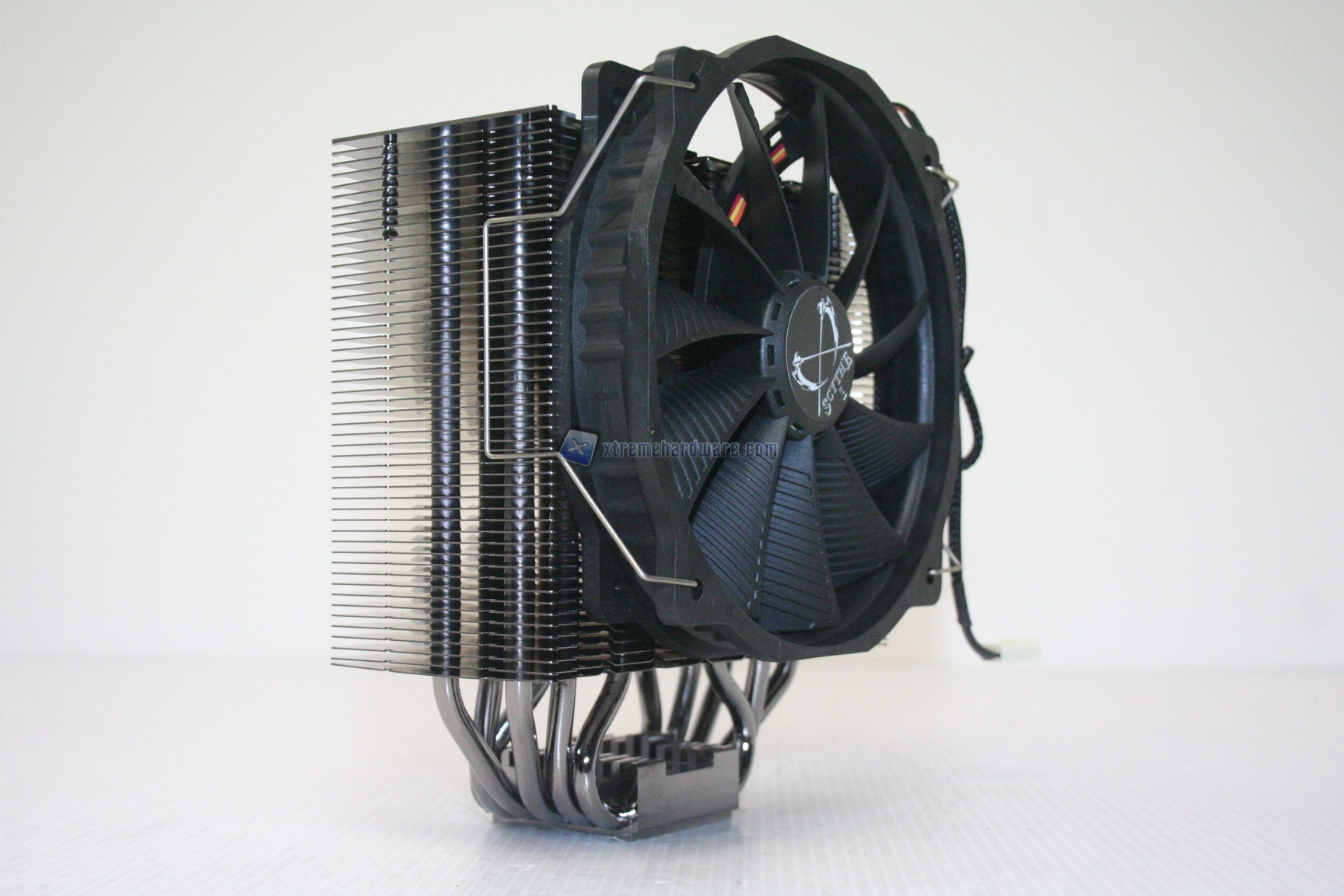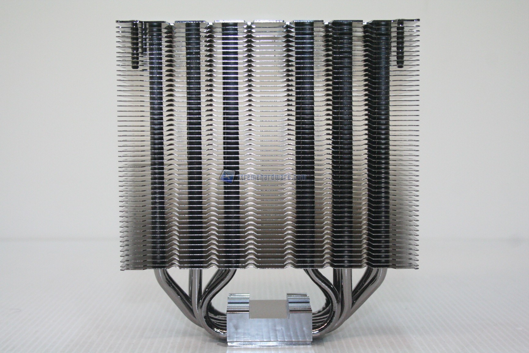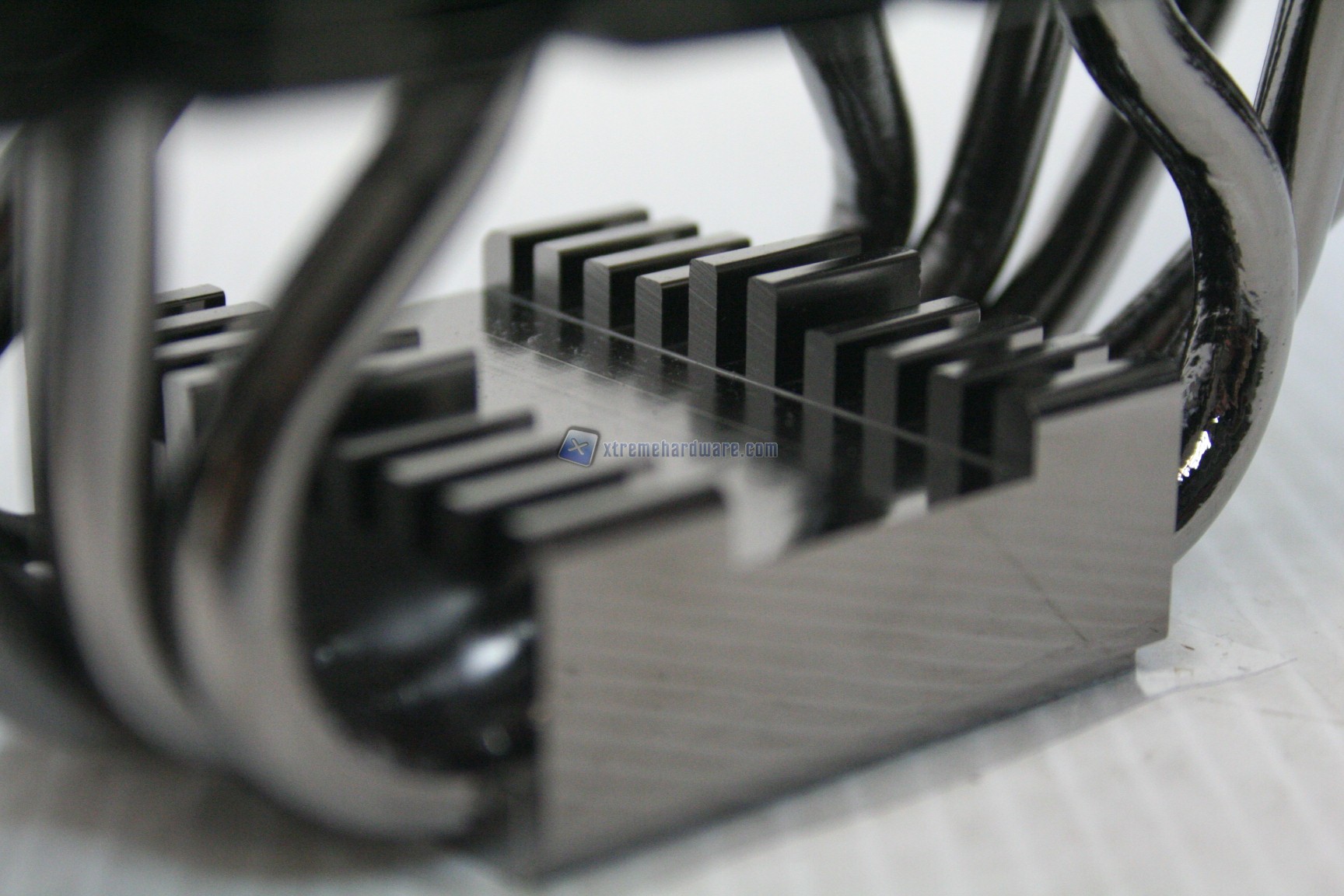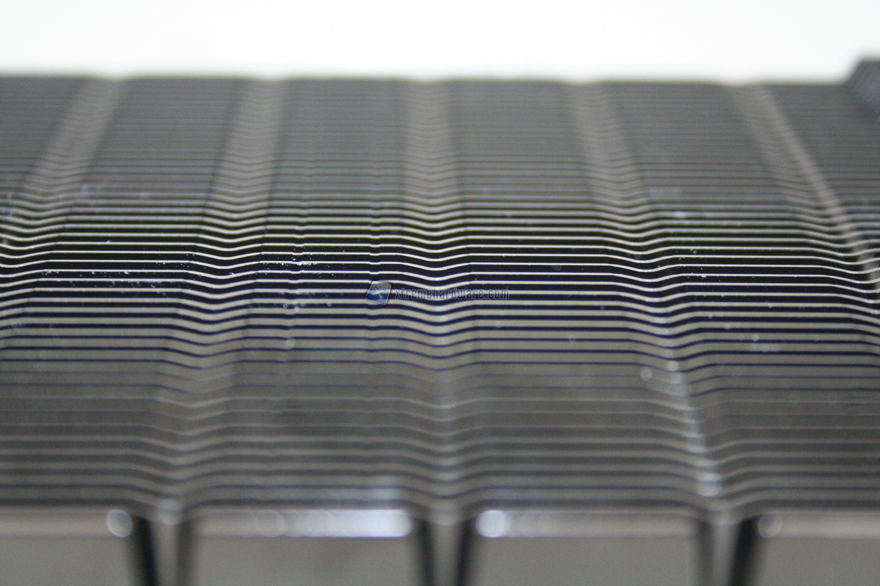 Oltre a questo, la lavorazione è di qualità elevatissima, ed il corpo dissipante presenta 6 heatpipes ad “U” distribuite quindi in modo eccellente sull’intero volume. Da notare le 6 rientranze frontali e posteriori, che spezzano i flussi d'aria in immissione, il particolare rialzo in prossimità di questi elementi e la finitura complessiva delle alette. Insomma, tutti elementi che denotano eccellenza costruttiva. La finitura in nichel integrale, è quindi assolutamente perfetta.
