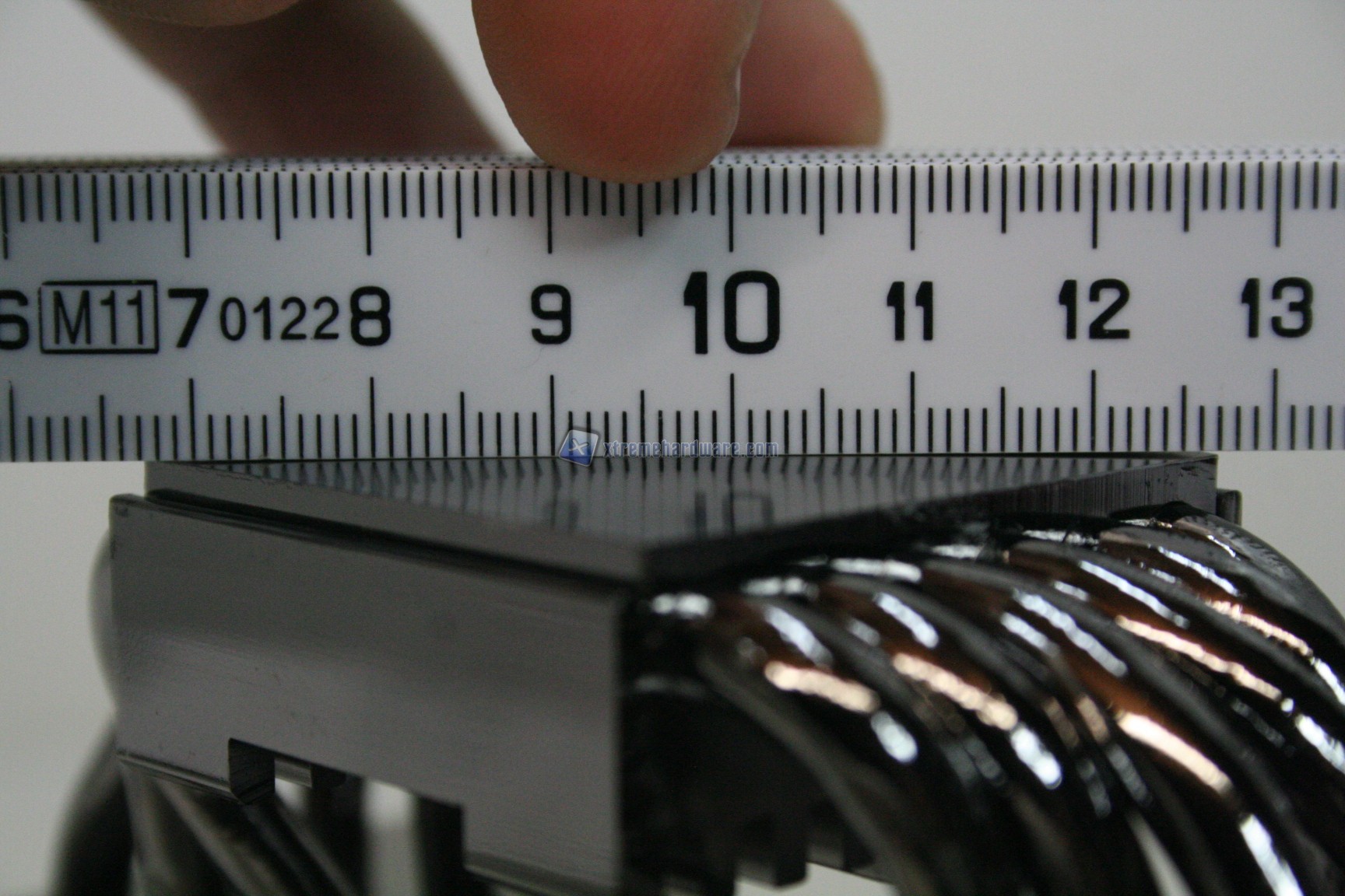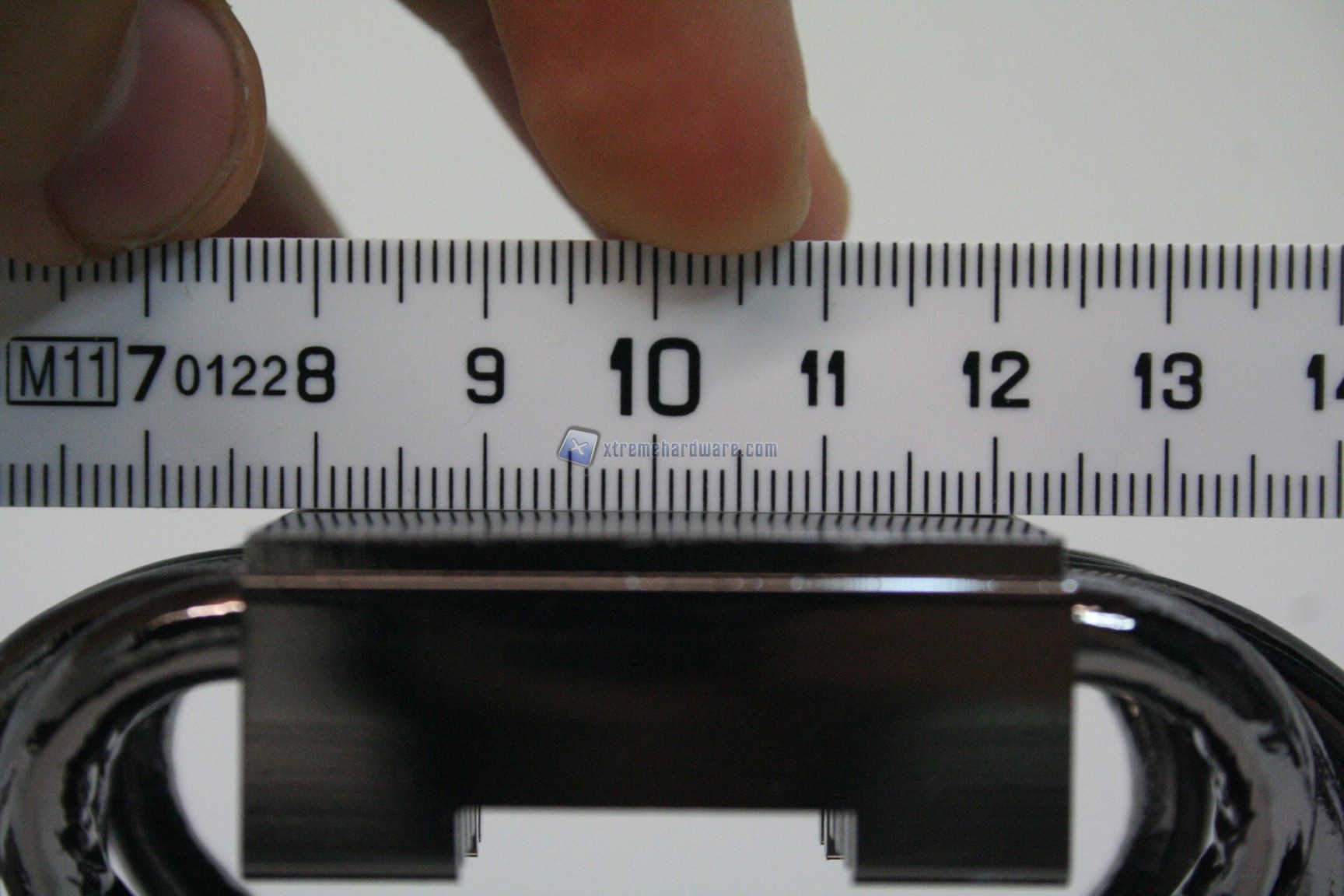 NOTA BASE CONVESSA: la base leggermente convessa è stata un marchio di fabbrica della ditta Thermalright. E’ stata adottata in quanto il socket di ritenzione delle moderne CPU, a partire dalle soluzioni aventi socket 775, era solito presentare una curvatura leggermente concava, il che ovviamente era deleterio per l’efficienza massima di scambio termico. Con il dissipatore Thermalright Ultra-120 è stata introdotta in commercio ed è ormai molto comune l’adozione di questo sistema. Precisiamo però che con il moderno socket Sandy Bridge-E non è più presente nessuna concavità nel sistema di ritenzione, che risulta essere perfettamente lineare.