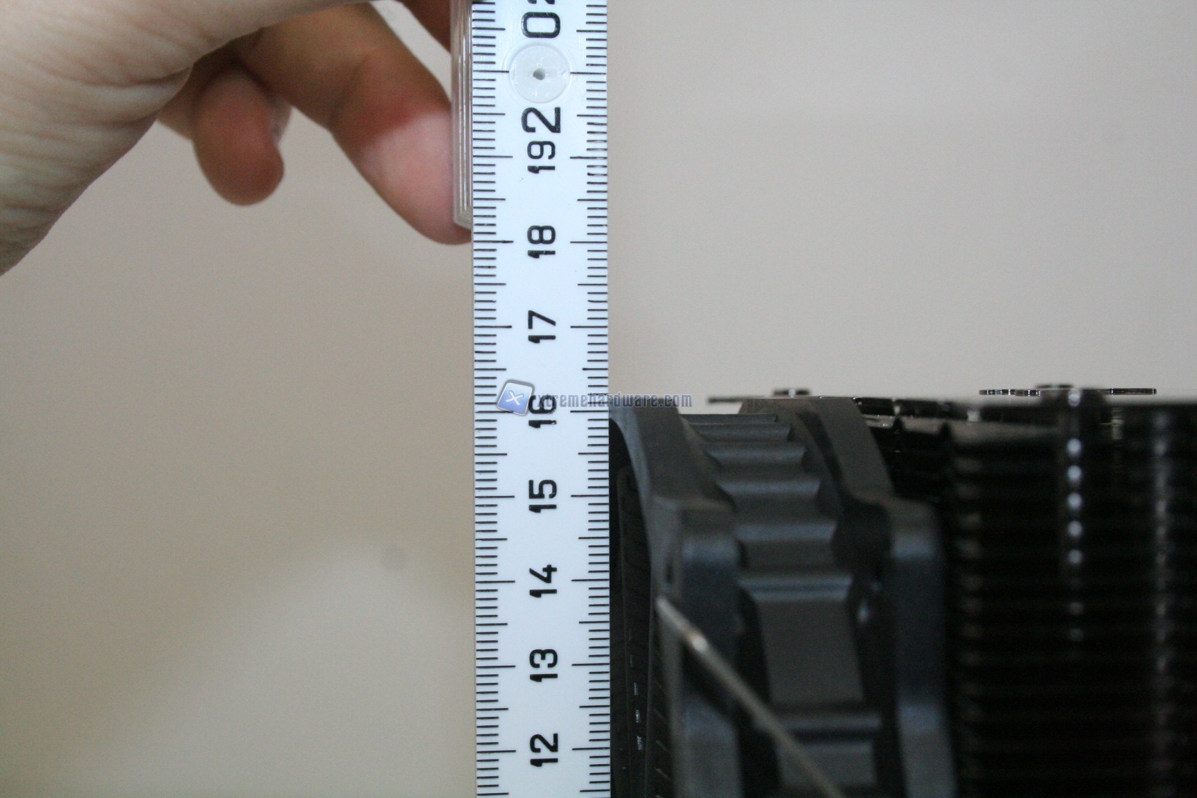 Per quale ragione sono presenti misurazioni diverse? Perché il sistema di montaggio della ventola permette un rialzo della stessa, per ovviare a problemi di compatibilità con RAM ad elevato profilo. Ad esempio, nella prima immagine è riportata la configurazione standard, nella seconda una ribassata, nella terza una rialzata, compatibile con RAM Corsair Dominator GT, e sistema di dissipazione DHX+ (http://www.corsair.com/en/dominator-gt-1-5v-8gb-ddr3-memory-kit-with-dhx-pro-connector-and-airflow-2-fan-cmt8gx3m2b2133c9.html)