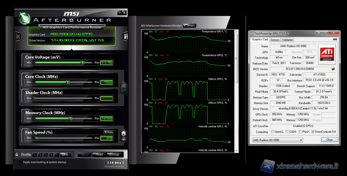 Dopo aver provato intensivamente questa scheda con tutti i giochi e i benchmark di rito, abbiamo voluto testare la HD 6990 cercando il massimo overclock possibile sempre con il suo dissipatore ad aria. Abbiamo utilizzato, per overcloccare la scheda, il software MSI Afterburn, le ultime versioni di questo programma permettono anche di modificare il voltaggio della gpu. Abbiamo impostata la modalità OC selezionando dal bios la modalità 2: